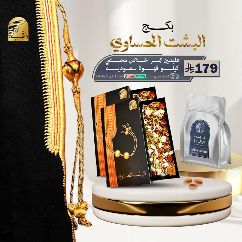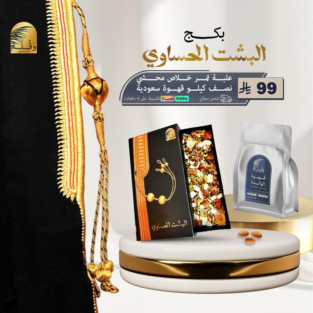 اجعل كل لحظة خاصة مع بكج البشت الحساوي الذي يجمع بين الجودة والتنوع. استمتع بتجربة فريدة مع مزيج مثالي من منتجات التمور والقهوة التي تعبر عن عراقة البشت الحساوي والكرم السعودي. اطلبه الآن واجعل مناسبة العيد أكثر جمالًا مع منتجات وقلة الأصيلة.